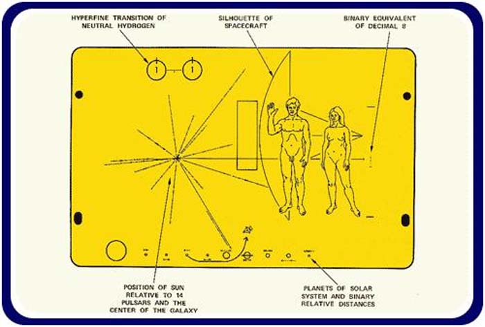 Pioneer 10, which was launched 30 years ago, carries a gold plaque engraved a map indicating Earth's location in the solar system, along with a message of goodwill. Here is the plaque: