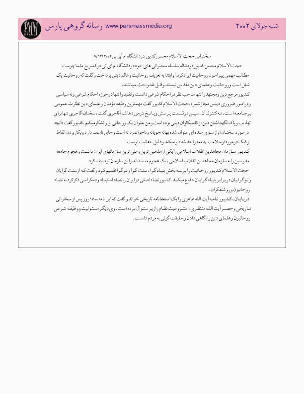 Pars Mass Media-Hojatoleslam Kadivar's Speech at MIT